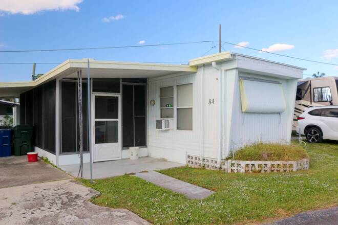 Looking for that quaint little beach cottage near the water? Look no further; this is the one! A one-bedroom, one-bath mobile home located in a 55+ community called Royal Palms Mobile Home Park. In addition to the home is a large side lanai, a carport, and an outdoor shed. Low monthly costs for this home, located near prime shopping, restaurants, and close to beaches in either direction.